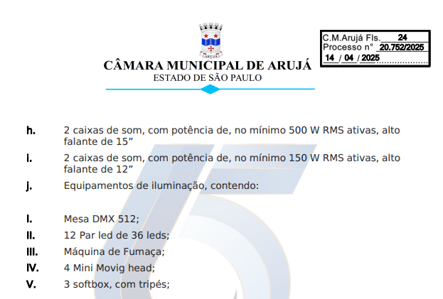 Máquina de fumaça, mesa DMX 512 para iluminação, 12 pares de LEDs 36 e 4 mini moving heads. Esses são alguns dos itens solicitados pela Câmara de Arujá no edital do Pregão Eletrônico n.º 01/2025, cujo objetivo era a contratação de uma empresa para a prestação dos cursos de formação continuada da Escola do Legislativo. Os itens foram alvos de questionamento da Ação Civil Pública movida pelo Ministério Público de São Paulo contra o Legislativo arujaense.