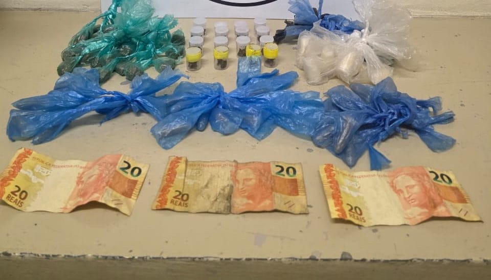 O suspeito foi abordado e, em revista pessoal, nada de ilícito foi encontrado. No entanto, ao ser questionado, ele confessou que o material abandonado estava sob sua posse e seria entregue a outra pessoa. Dentro da bolsa, os policiais encontraram 28 porções de spice, 28 de maconha, 43 de cocaína, 16 de skank e R$ 60.