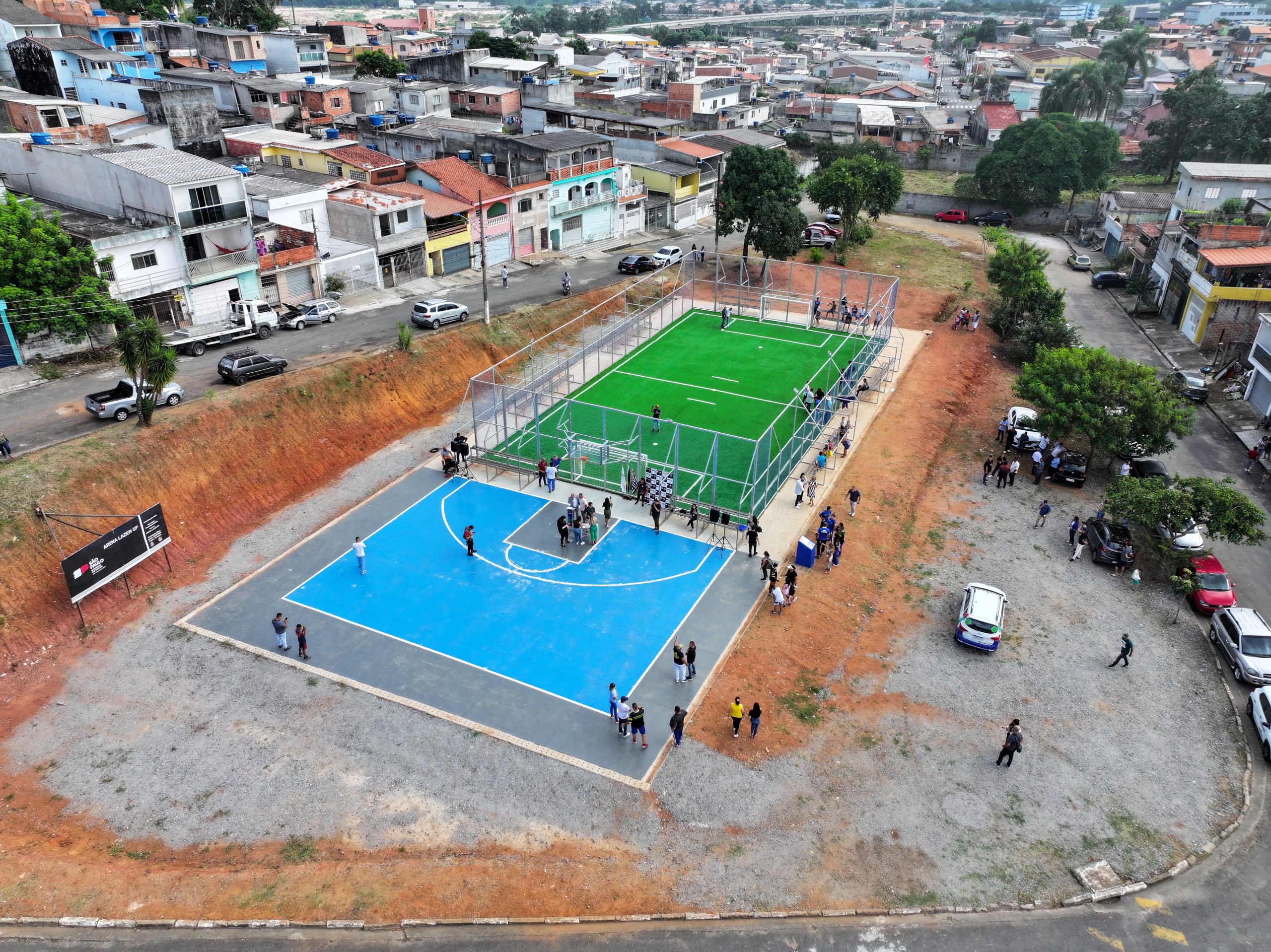 Nesta segunda-feira (15), foi inaugurada em Itaquaquecetuba a Arena Lazer SP, no Jardim Altos de Itaquá. Com investimento de R$ 603 mil e área construída de 1.025 m², o local conta com quadra de gramado sintético, arquibancada e uma quadra de basquete de rua 3×3.