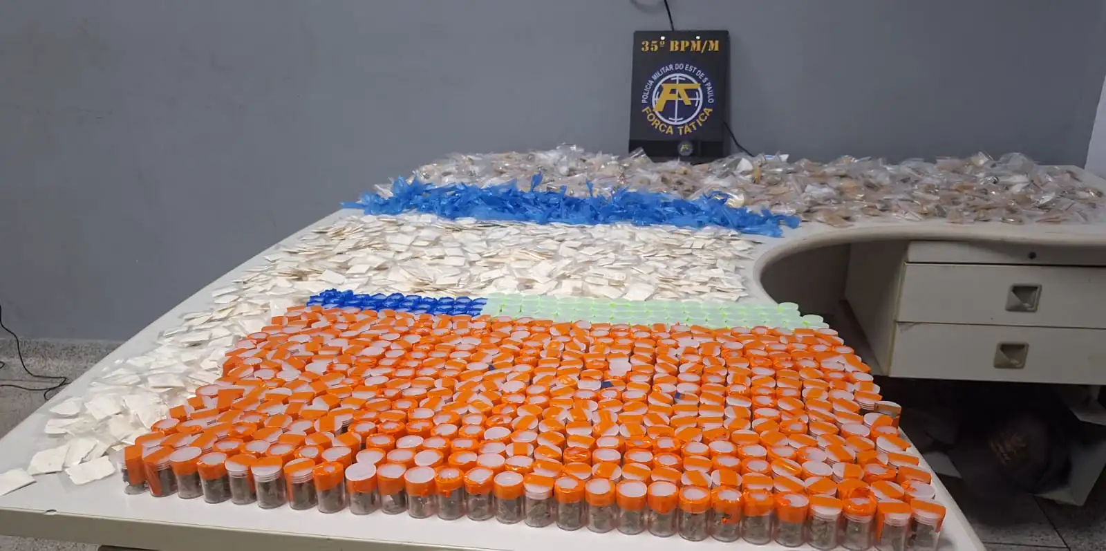 A Polícia Militar prendeu, em flagrante, um homem por tráfico de drogas na Vila Monte Belo, em Itaquaquecetuba. Com ele, foram encontrados cerca de 5,7 kg de drogas, distribuídos em mais de 2,1 mil porções de maconha, crack e cocaína, que seriam vendidos em São Paulo.