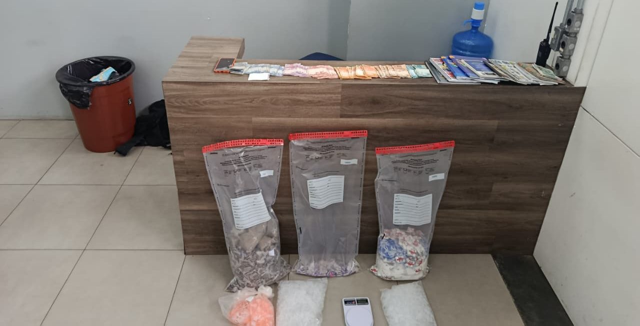 Na casa da suspeita, os policiais encontraram 1.724 porções de maconha (3,915 kg), 3.182 porções de cocaína (2,39 kg) e 262 embalagens de crack (255 g), além de uma balança de precisão, um celular e R$ 3.378 em dinheiro. Também foram apreendidos cadernos com anotações do tráfico e materiais usados para embalar as drogas.