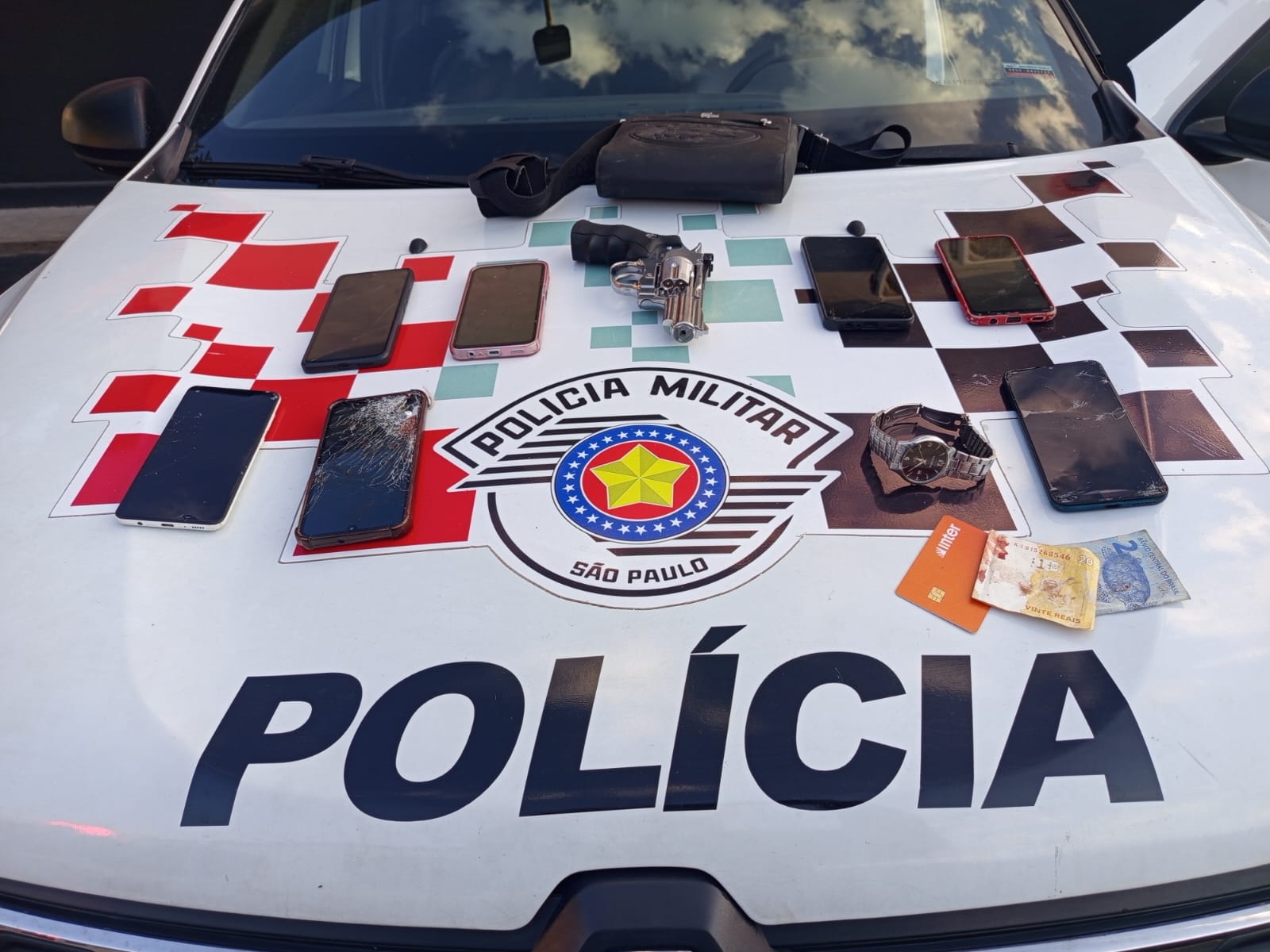 Suspeito foi preso com sete celulares e um simulacro de arma | Divulgação/PM