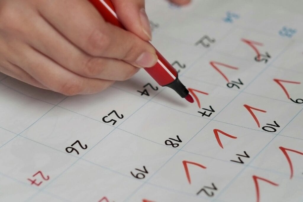 Mão de uma pessoa segurando uma caneta vermelha e fazendo vistos em um calendário