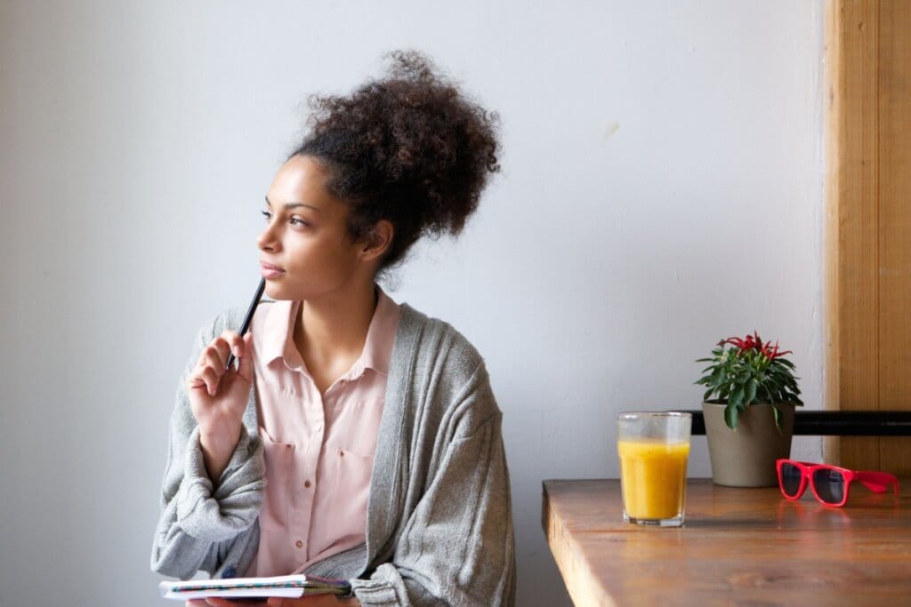 Mulher sentada pensando e segurando uma caneta