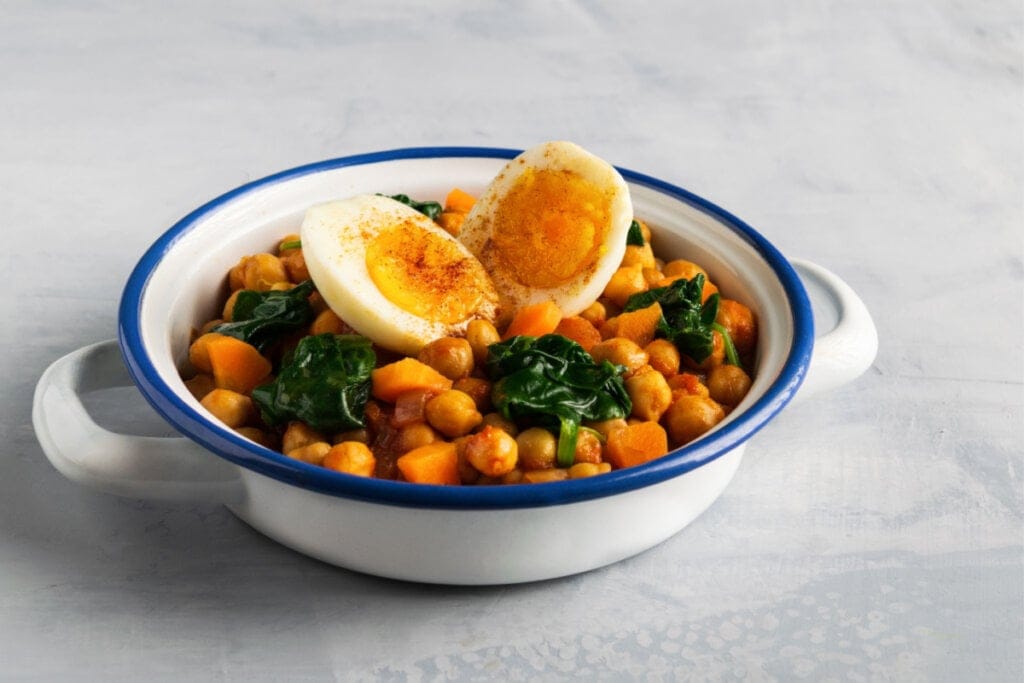 Separe as folhas e os talos do espinafre. Em seguida, pique os talos bem finos. Em uma panela, aqueça o azeite em fogo médio e refogue a cebola e o alho. Adicione os talos de espinafre e refogue por 2 minutos. Junte o grão-de-bico e a cenoura mexa bem, até aquecer. Tempere com sal, pimenta-do-reino, canela e páprica e misture. Depois, junte as folhas de espinafre e refogue até murcharem e secar a água que se formou. Desligue o fogo e sirva em seguida com o ovo cozido cortado ao meio. Tempere o ovo com uma pitada de páprica.