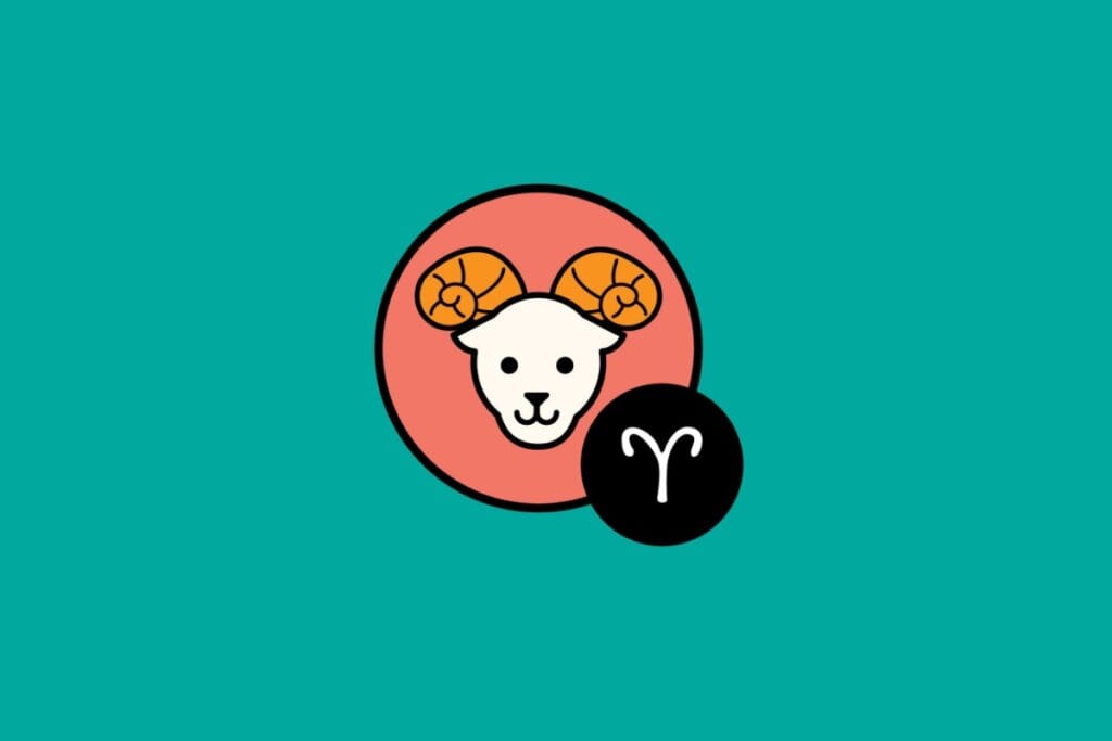 Ilustração do signo de Áries, em fundo verde-azulado, contendo a cabeça de um carneiro branco com chifres laranja em espiral dentro de um círculo avermelhado e o símbolo astrológico em um círculo preto