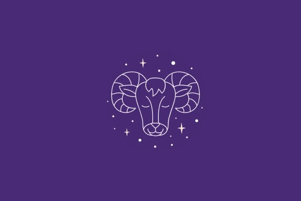 Ilustração do signo de Áries em um fundo roxo rodeado por estrelas