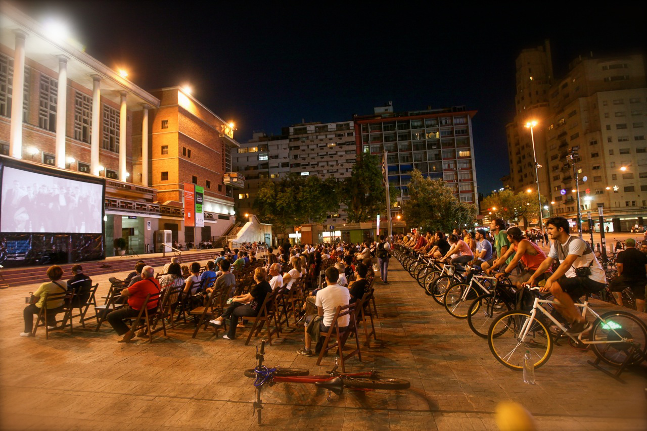 O público pode escolher de onde assistir aos filmes: acomodados na plateia de cadeiras ou pedalando nas estações de bicicletas, participando ativamente.