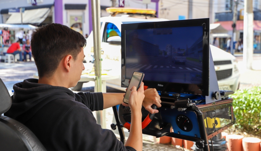 Nesta quarta-feira (22), as pessoas que passaram pelo Largo do Rosário puderam participar de uma ação do Maio Amarelo de Mogi das Cruzes, o Simulador de Distração. O equipamento, lançado pela Secretaria Municipal de Mobilidade Urbana, chama a atenção para os riscos existentes quando os motoristas utilizam o celular enquanto dirigem.